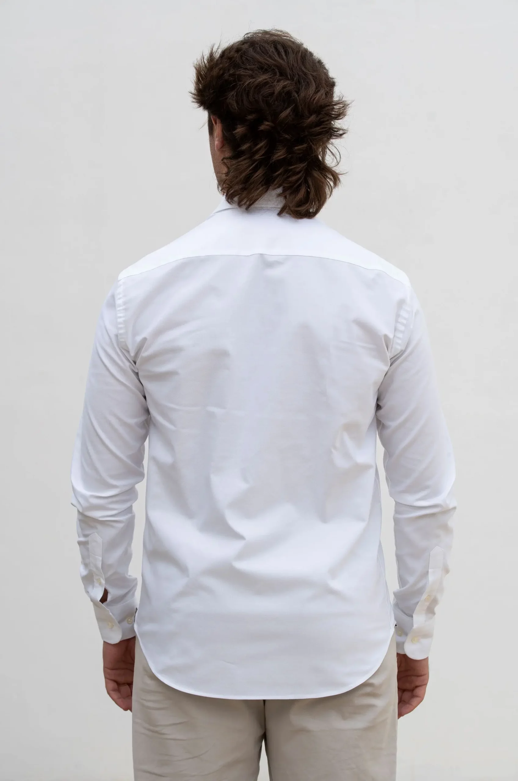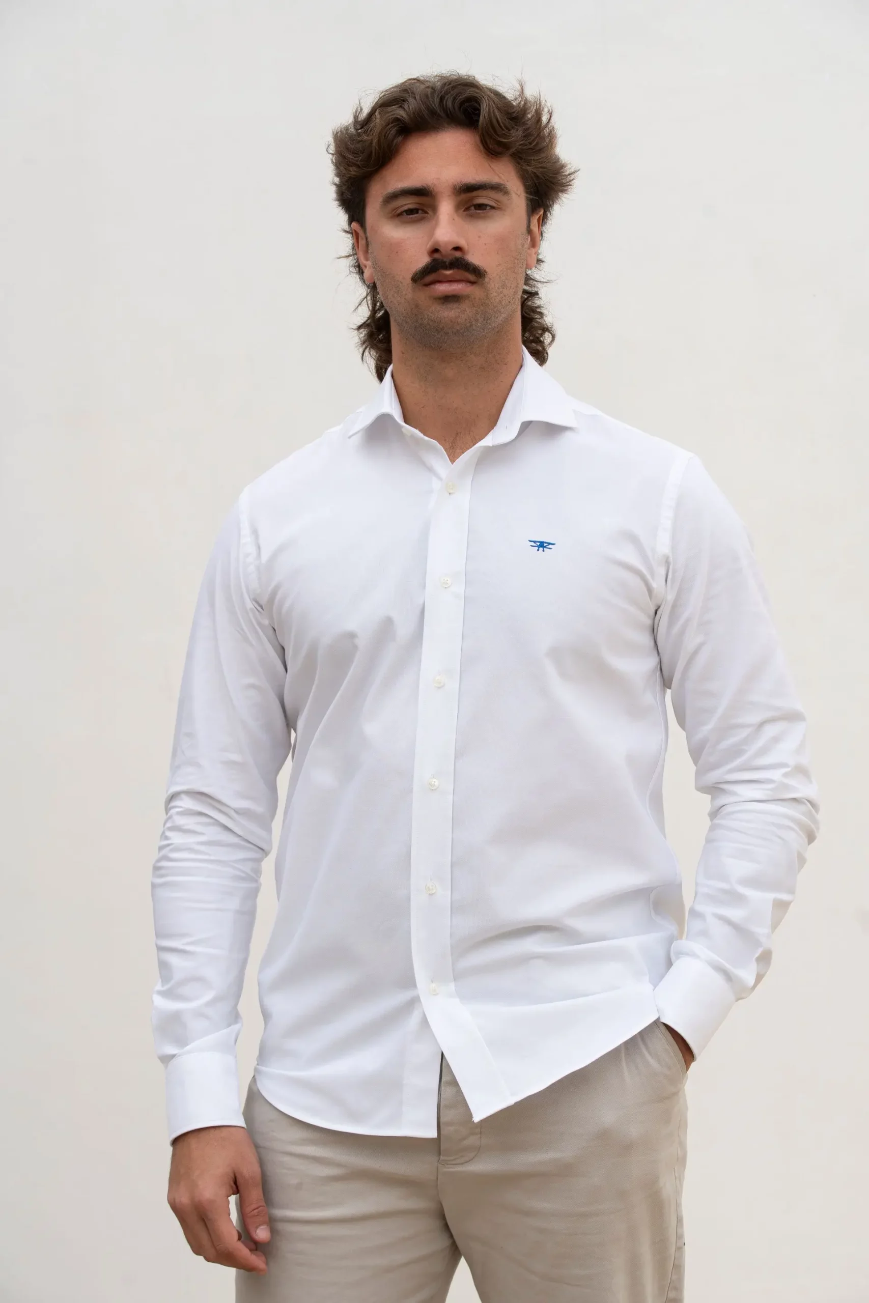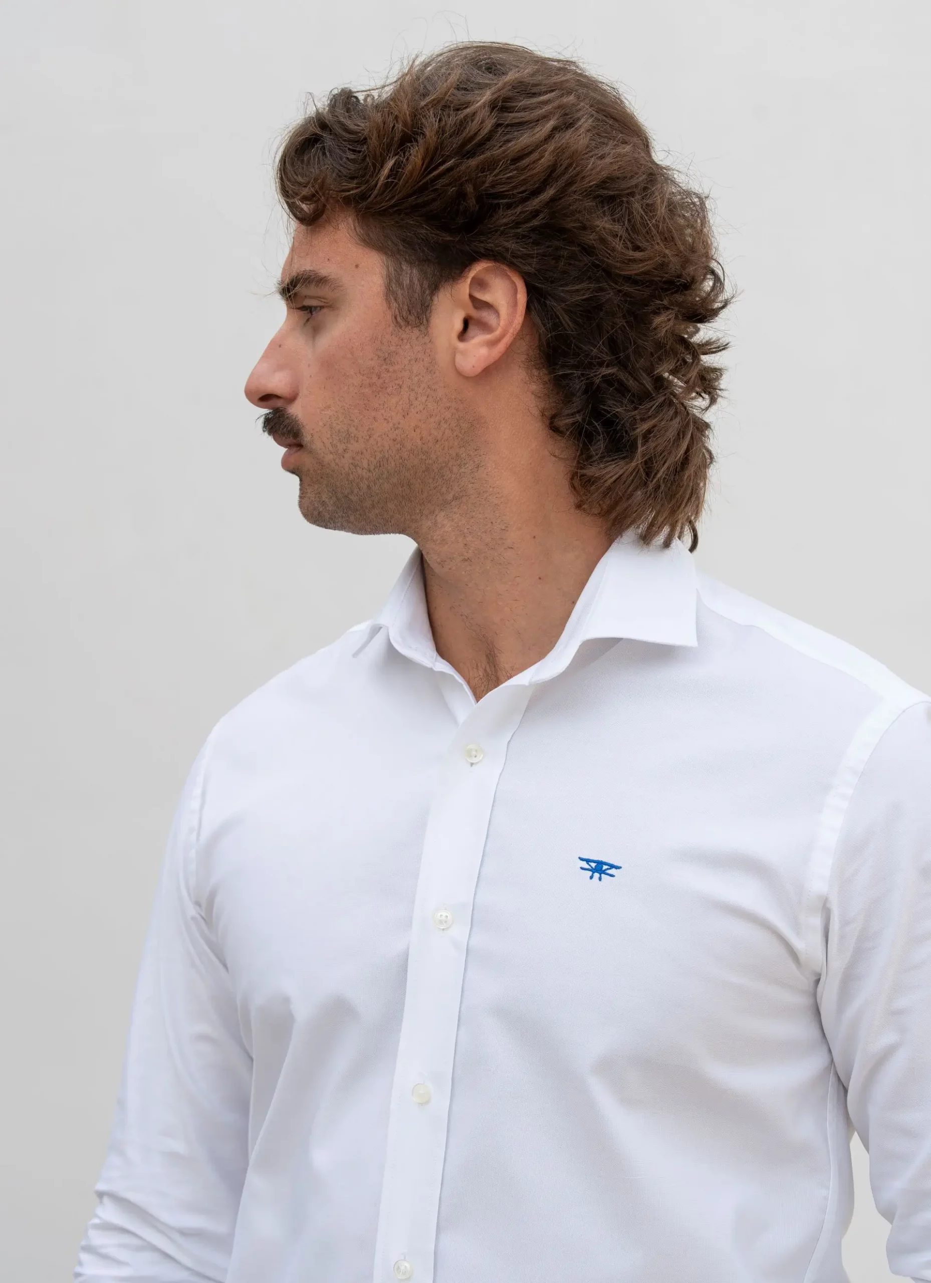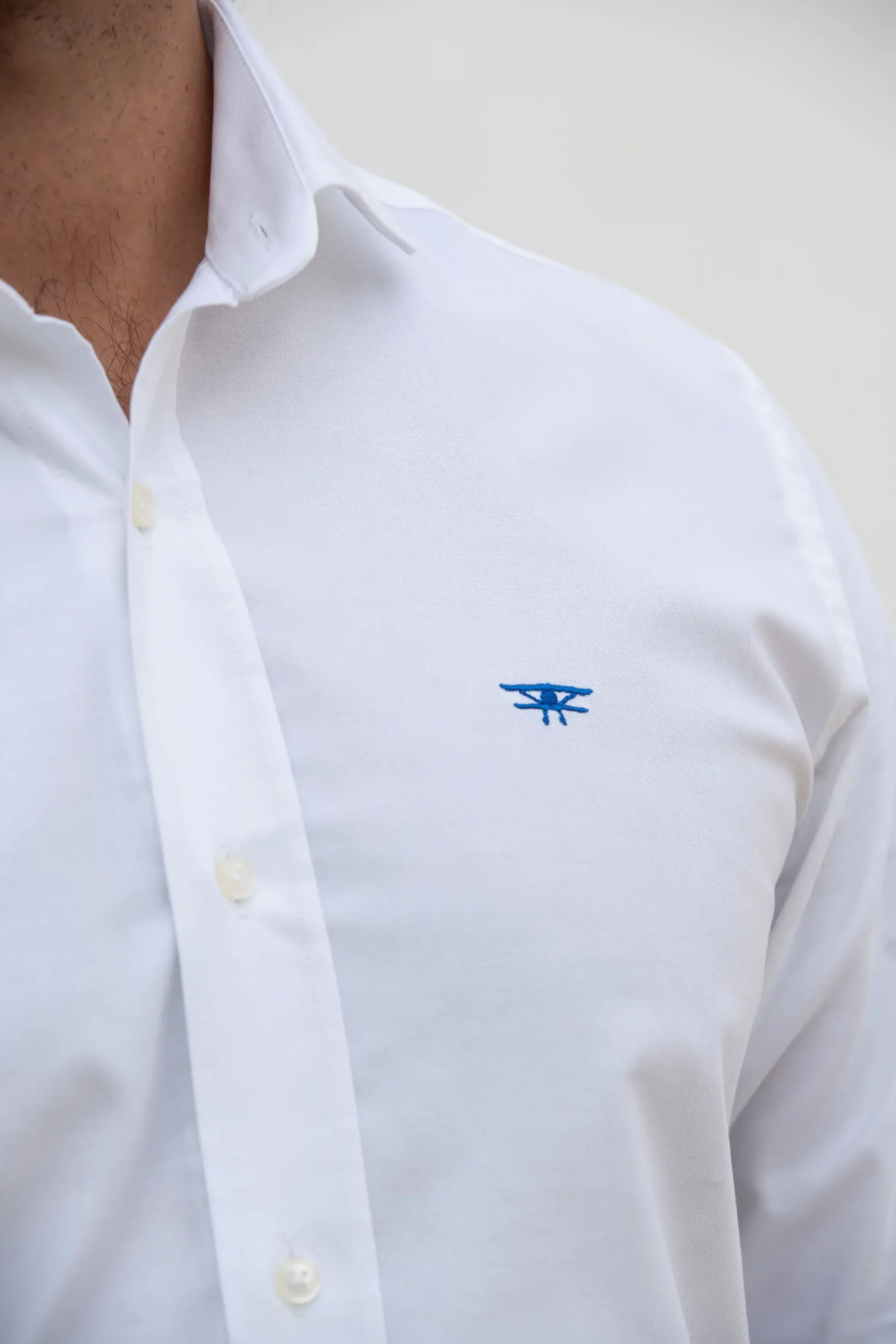 Camisa confeccionada en algodón 100%. Regular, cuello cutaway y avioneta bordada en azul